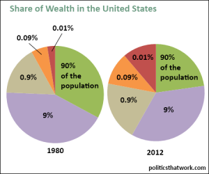 There has been an erosion of economic power of the middle class in the United States since the 1980’s. The wealth of the richest country ever has shifted from the masses up towards the richest of the rich. What does this look like in most of our lives? Longer hours for less pay. Most families can no longer survive with just one wage earner. Good full time jobs have disappeared and low-wage part-time employment has become the norm. People often must hold down 2 or more part-time jobs just to make ends meet. It is sad but true, the rich are getting richer and the poor are getting poorer.